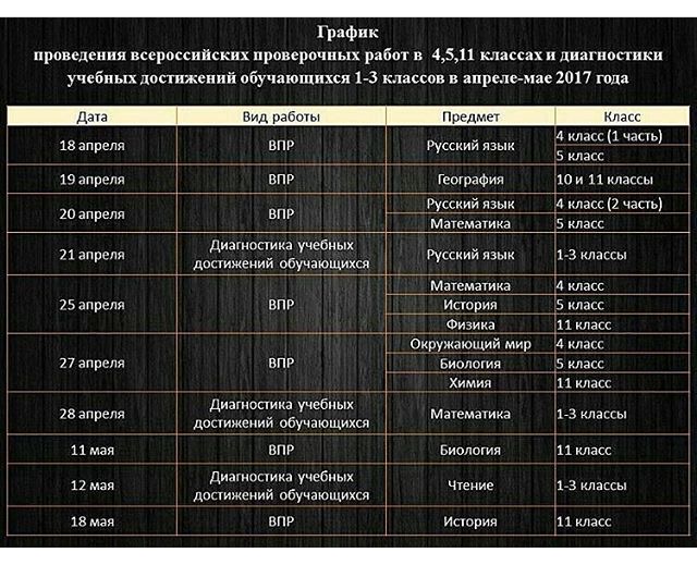 График проведения всероссийских проверочных работ в 4, 5, 11 классах и диагностики учебных достижений обучающихся 1-3 классов в апреле-мае 2017 года