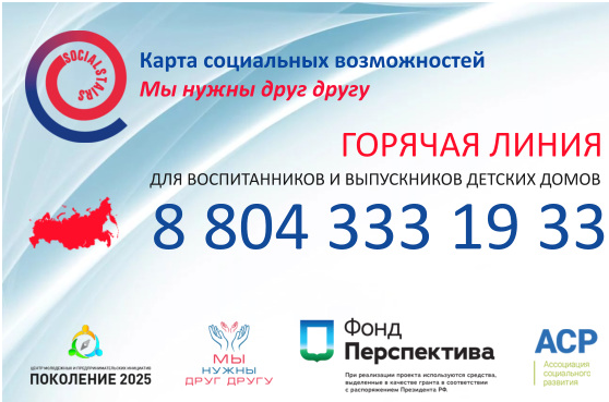 Карта социальных возможностей - это масштабный, федеральный проект для воспитанников и выпускников детских домов. Проект реализует Центр молодежных и предпринимательских инициатив "ПОКОЛЕНИЕ 2025 при поддержке АНО "Мы нужны друг другу".