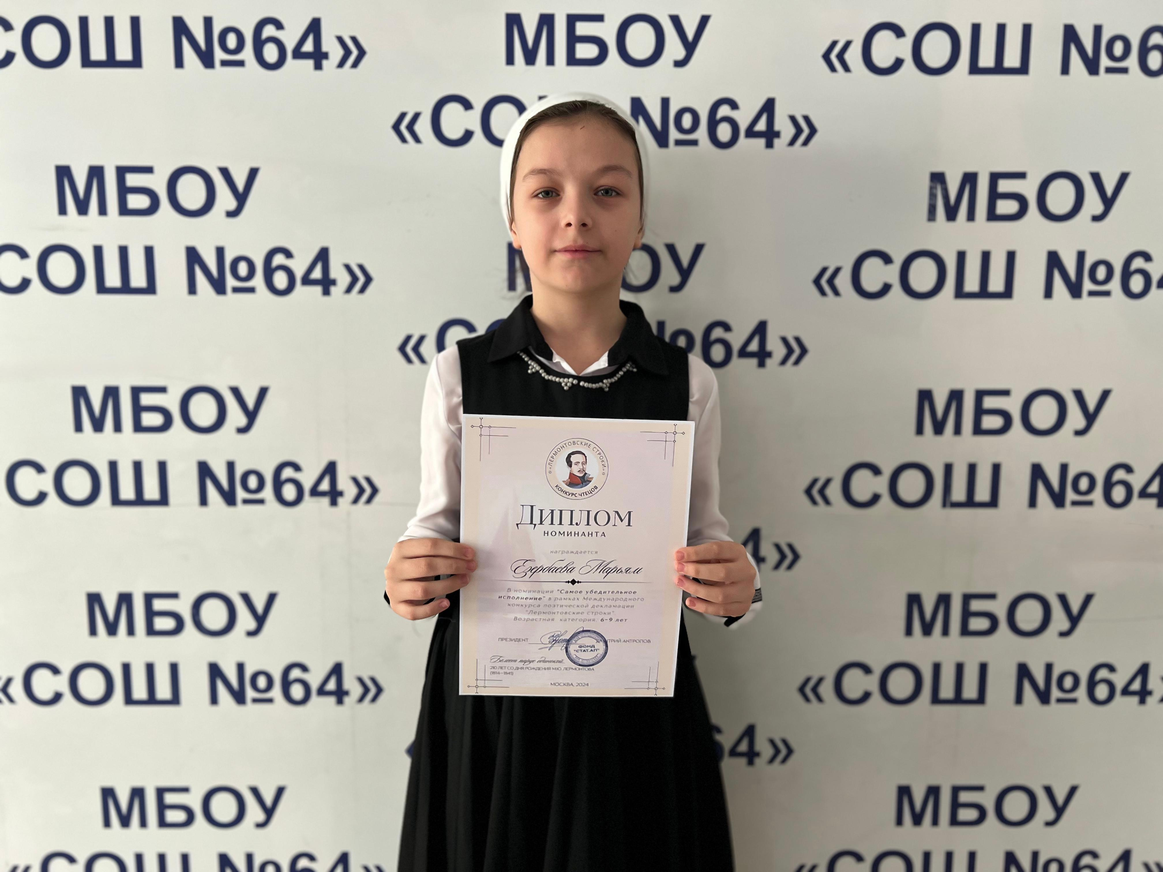 01.01.2025🔹Езербаева Марьям, ученица нашей школы приняла участие в Международном видеоконкурсе поэтической декламации «Лермонтовские строки», посвящённом 210-летию со дня рождения великого русского поэта Михаила Юрьевича Лермонтова.